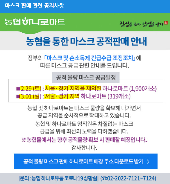 | 전국 농협 하나로마트 마스크 판매 지점 (시간, 위치, 전화번호) (0) | 2020.03.04 |