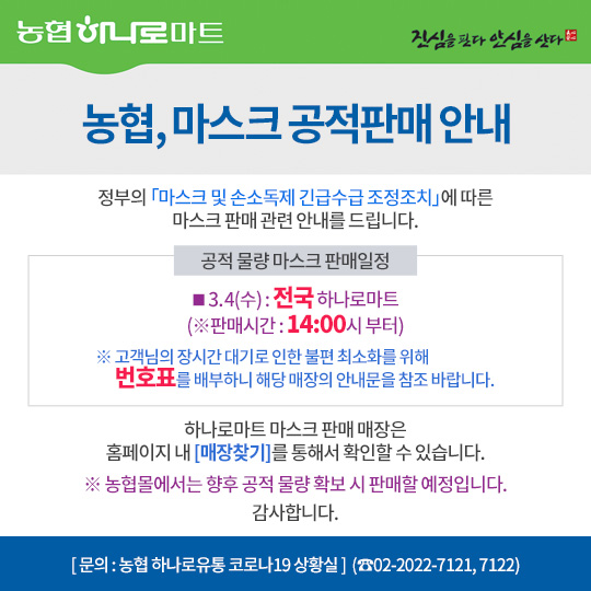 마스크는 전국 하나로마트에서 판매합니다.